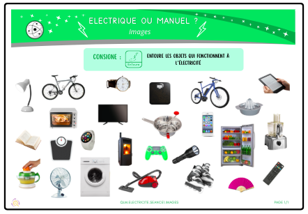 Le.la PE distribue une fiche avec les images à chaque binôme et explique : « Sur cette feuille, vous avez plusieurs objets. Certains fonctionnent à l’électricité et d’autres non. Vous allez entourer tous les objets qui fonctionnent à l’électricité. »