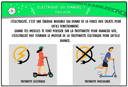 Le.la PE reformule les réponses des élèves et projette la trace écrite. Il.elle l'explique avant de la distribuer : « L’électricité, c’est de l’énergie, de la force qui permet aux objets qui en ont besoin de fonctionner. L’énergie de notre corps nous permet de bouger pour faire avancer la trottinette, tandis que l’énergie électrique permet de faire fonctionner le moteur de la trottinette électrique. »