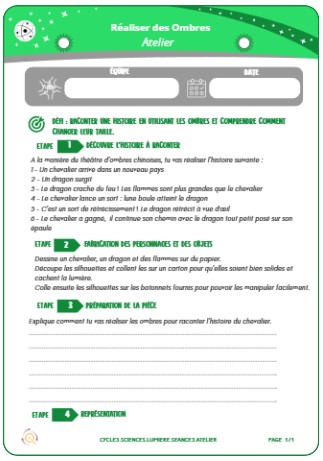Le.la PE distribue la fiche atelier et précise les consignes : « Vous allez suivre les consignes de la fiche atelier pour créer une petite histoire grâce aux ombres.»