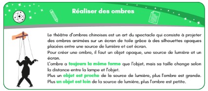 «Les ombres peuvent changer de taille ou se déformer selon la position de la lumière et de l’objet. Aujourd'hui, nous allons découvrir une façon très originale d’utiliser les ombres : le théâtre d’ombre chinois ! »