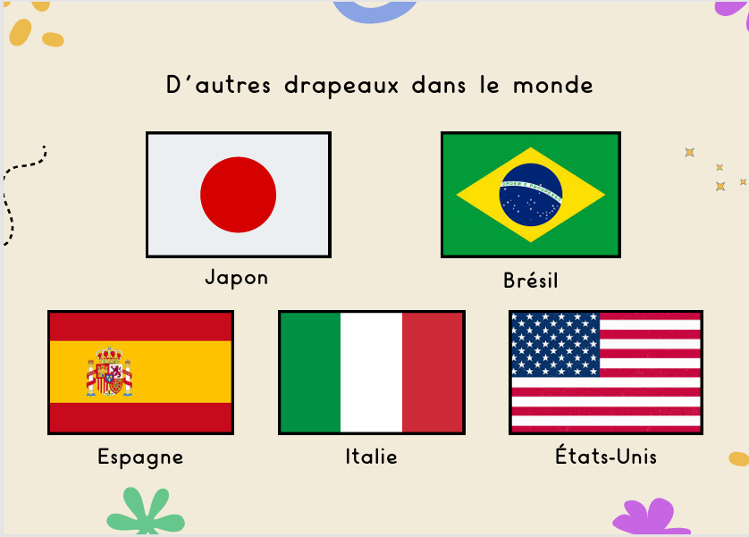 Le.la PE projette ou montre 4 ou 5 drapeaux d’autres pays (par exemple Espagne, Italie, États-Unis, Brésil, Japon).
