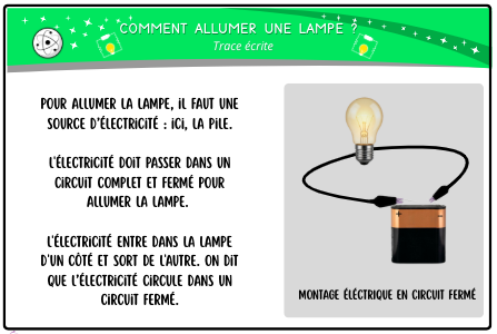 Quand tous les élèves ont terminés leur schéma, le.la PE projette la trace écrite et conclut : « Pour allumer la lampe, il faut une source d’électricité : ici la pile. L'électricité doit faire un circuit complet et fermé pour allumer la lampe. L'électricité sort de la pile, entre dans la lampe d'un côté et sort de l'autre pour revenir de l'autre côté de la pile. On dit que l’électricité circule dans un circuit fermé. »
