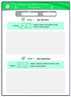 Le.la PE projette la fiche de travail et explique : « Avant de commencer à manipuler, tu vas réfléchir et imaginer le montage qu'il faut faire pour allumer la lampe avec le matériel que je viens de vous montrer. Tu le dessineras dans la première partie de cette fiche. Ce sera ton hypothèse. »