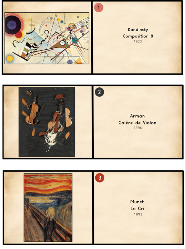 Aujourd’hui, tu vas découvrir des tableaux peints par des peintres célèbres, et des musiques classiques célèbres. Tu vas devoir associer une musique, et une œuvre à une émotion.