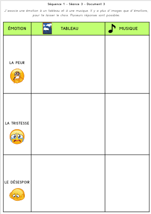 "Tu vas associer un tableau à une émotion. Attention, il y a plus d’œuvres d’art que d’émotion, c’est pour te laisser le choix et que tu associes le tableau qui te fait penser TOI à l’émotion. Il peut y avoir plusieurs réponses. A toi de jouer, tu découpes les étiquettes « œuvres d’art et tu les places dans le tableau ».