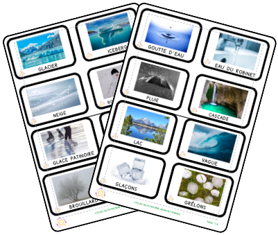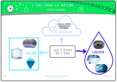 Le.la PE récapitule : « L'eau existe donc autour de nous sous 3 formes : à l’état liquide : nous avons l’eau de la mer, des lacs, des rivières, la pluie, l’eau que nous buvons. À l’état solide : nous avons les glaçons, la neige, les grêlons et enfin à l’état gazeux : nous ne la voyons pas. Pendant les prochaines séances nous essaierons de comprendre ce que signifient solide et liquide pour les scientifiques. »
