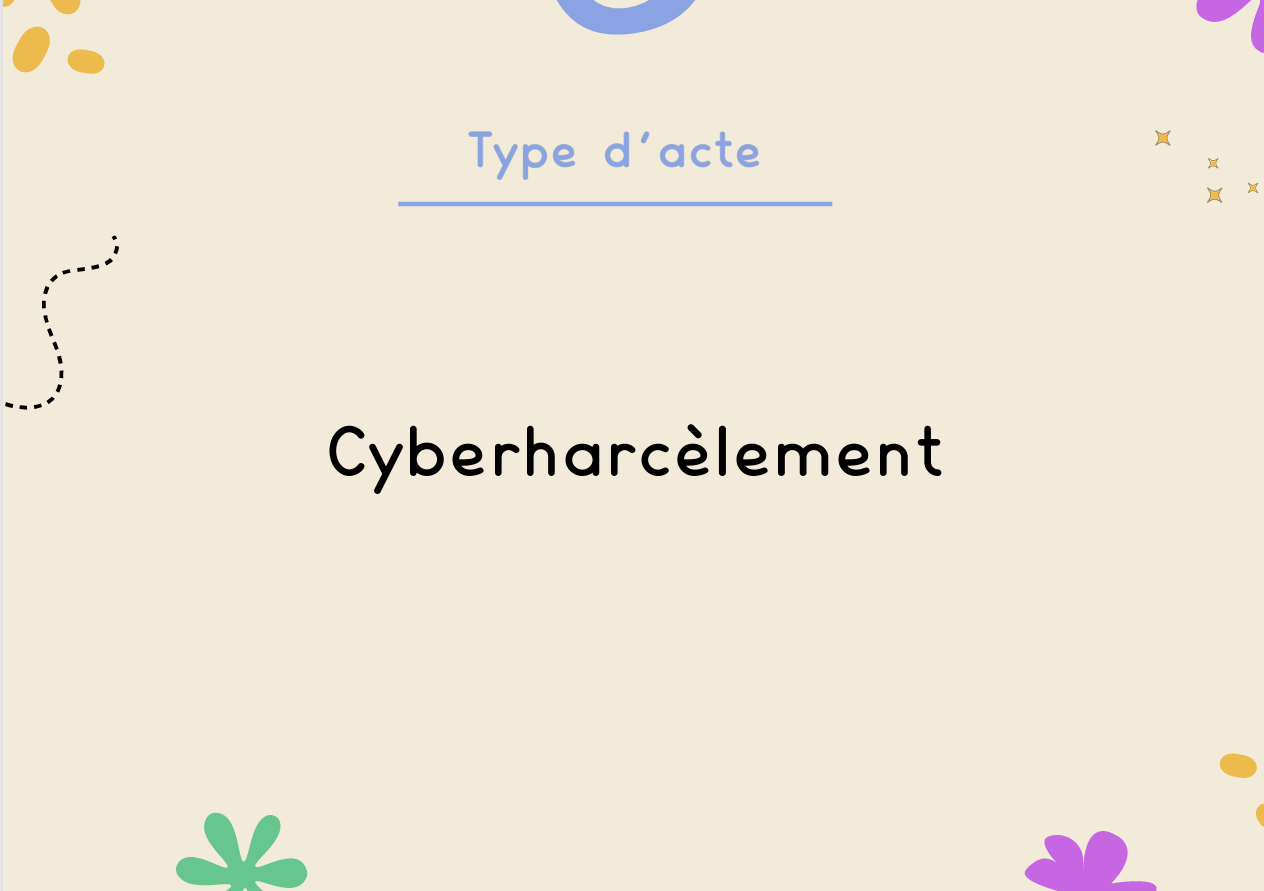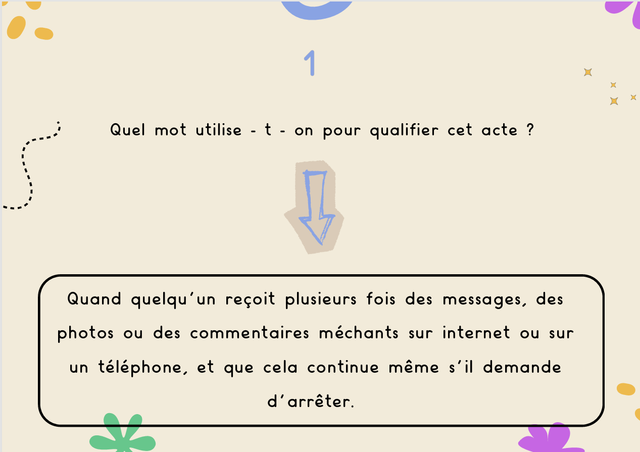 Le.la PE dit : “ Nous allons nous intéresser maintenant au cyber harcèlement. Pouvez-vous me dire ce que veut dire ce mot. Qu’est-ce qui est différent du harcèlement ? “