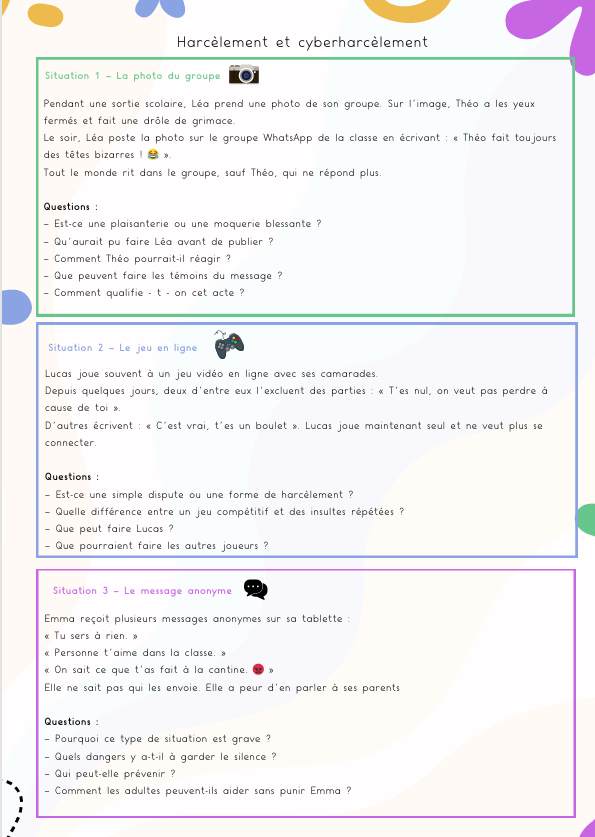 « Le harcèlement à l’école se caractérise par des violences répétées, verbales, physiques ou sociales, commises au sein de l’école ou en lien avec elle, créant un rapport de force et de domination. »