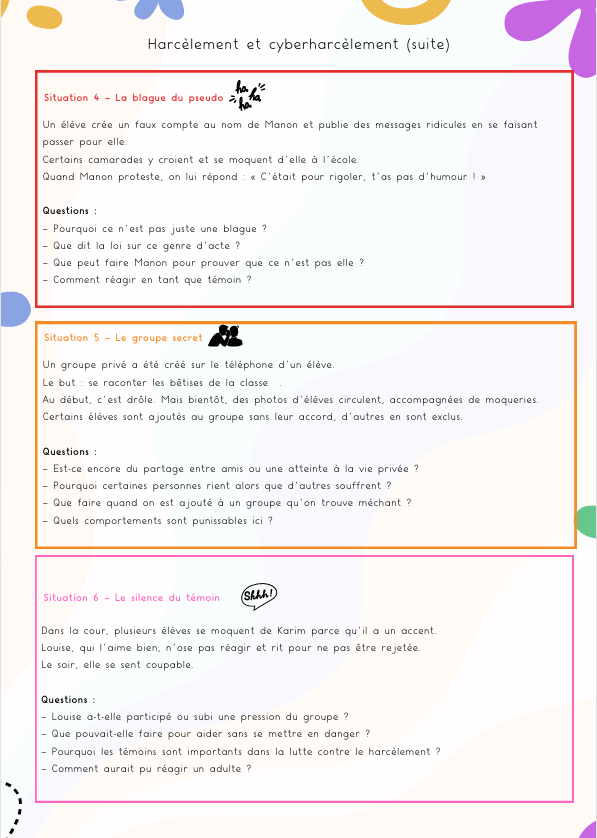 Le.la PE explique le travail “ Toujours par groupe, vous allez réfléchir sur des situations que vous pourriez connaître où il est question d’incivilités ou d’infractions. Il y a 8 situations en tout. Pour chacune d’entre elles, vous avez des questions auxquelles vous allez répondre à l’oral. Lorsque c ‘est bon pour vous, vous pourrez prendre la fiche correction pour vérifier la justesse de vos réponses. Vous pourrez alors piocher une autre situation.
