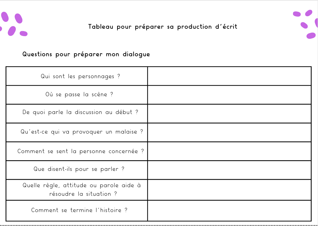 Certains élèves peuvent avoir des difficultés à trouver une idée de situation ou à se lancer dans l’écriture. Le tableau préparatoire sert alors de véritable appui à la pensée. Il est conseillé de privilégier le remplissage à l’oral avant le passage à l’écrit, notamment pour les groupes les plus fragiles.