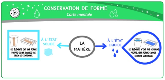 Le.la PE projette la trace écrite et reformule : « Quand je place un objet à l'état solide dans un contenant, sa forme ne change pas. Quand je verse un élément à l'état liquide dans un contenant, sa forme prend la forme du contenant, on dit qu'il n'a pas de forme propre. »