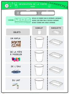 Le.la PE projette la fiche et explique : « Tu vas noter tes observations sur cette fiche. Prends un élément, mets-le dans le gobelet, puis dans la barquette. À chaque fois, regarde bien sa forme et dessine sur ta fiche ce que tu vois. »