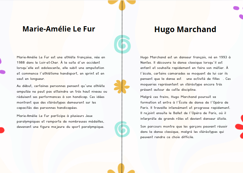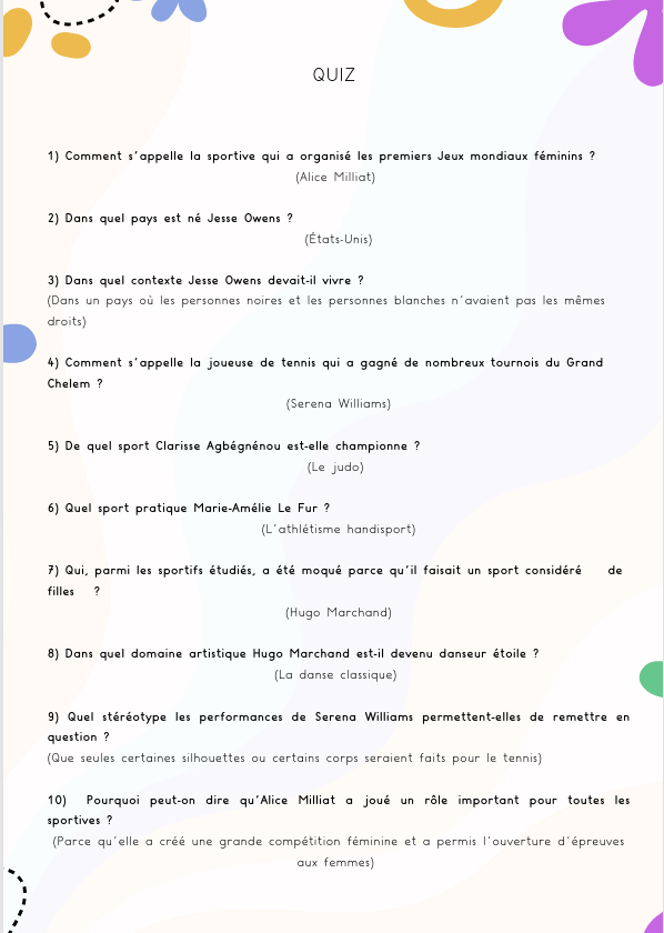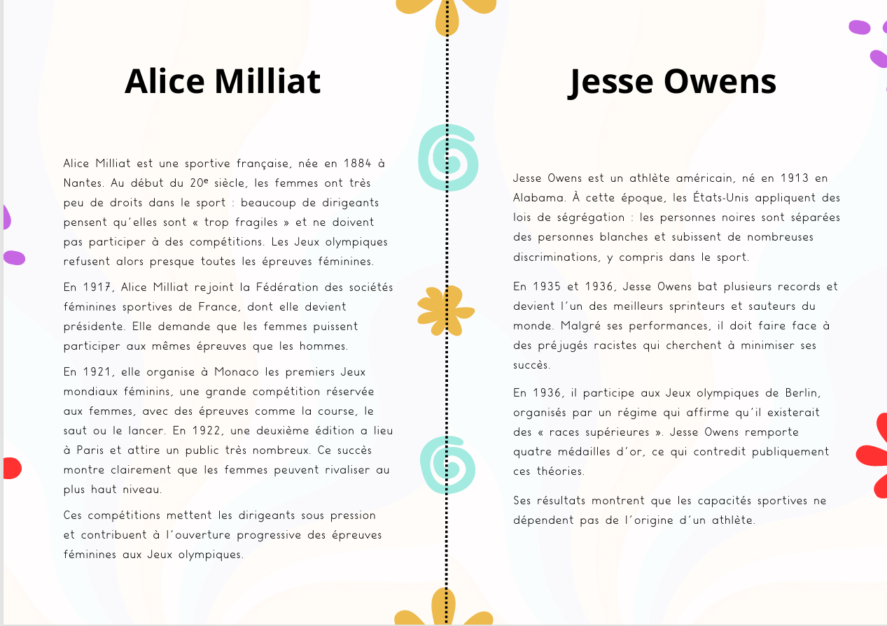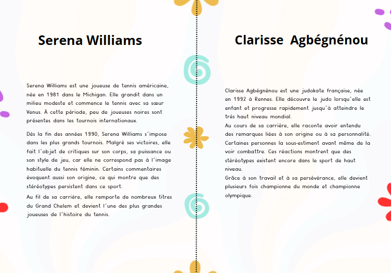 Comprendre ce qu’est un stéréotype, repérer différents types de stéréotypes dans le sport (genre, racistes, liés au handicap, à l’apparence), et découvrir comment certaines personnes ont contribué à faire évoluer les droits et les mentalités.