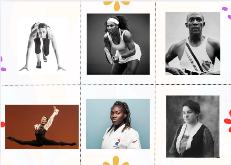 Le.la PE distribue les six portraits (Alice Milliat, Jesse Owens, Serena Williams, Clarisse Agbégnénou, Marie-Amélie Le Fur, Hugo Marchand).