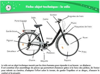 « Le vélo est un objet technique inventé pour répondre au besoin de se déplacer. Il est constitué d’un assemblage de pièces qui permettent d’avancer, de freiner, de se diriger, d’adapter l’effort et d’assurer sécurité et confort. »