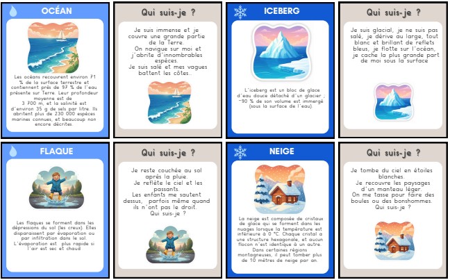 Le.la PE valide la paire et ajoute si besoin des précisions. Puis un autre élève lit sa devinette, et le jeu continue ainsi jusqu’à ce que toutes les cartes aient trouvé leur partenaire.
