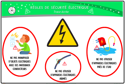 Le.la PE projette et distribue la trace écrite et conclut : « L’électricité doit être manipulée avec précaution. Il ne faut jamais manipuler d’appareils électriques près de l’eau, avec des matériaux conducteurs ou lorsqu'ils sont abîmés. »