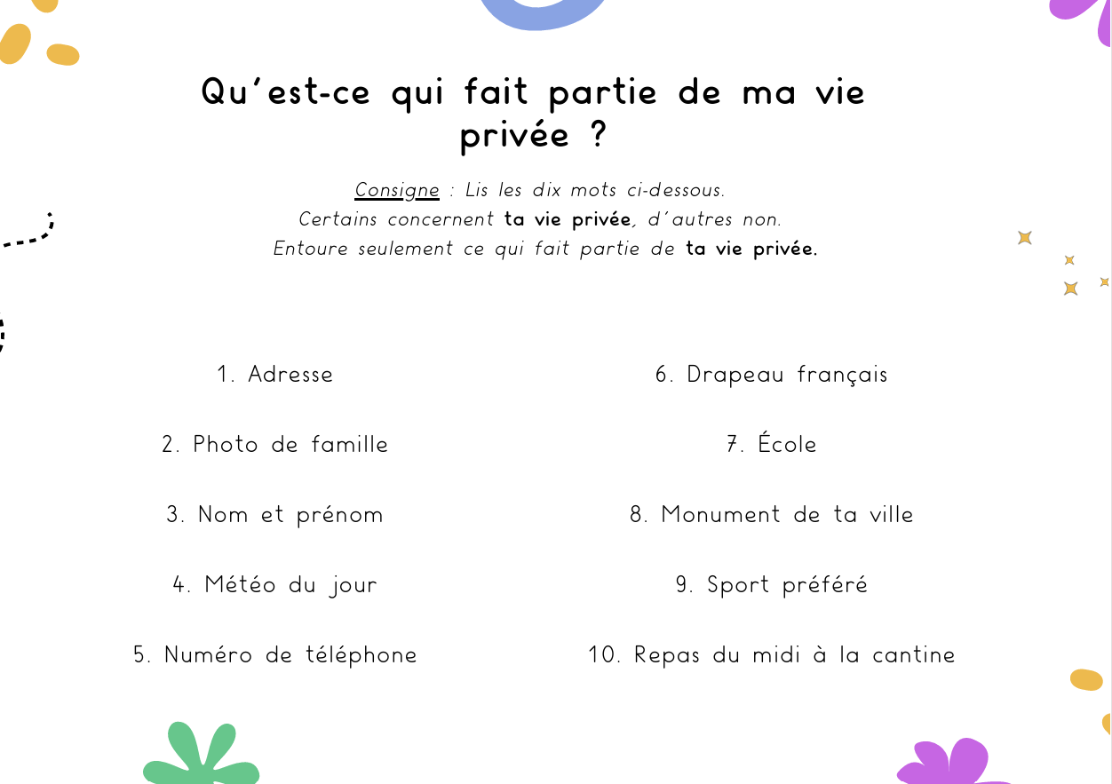 Réponse attendue : La vie privée, ce sont toutes les informations qui parlent de toi personnellement ou de ta famille. Ces informations ne doivent pas être partagées avec n’importe qui, surtout sur Internet. »