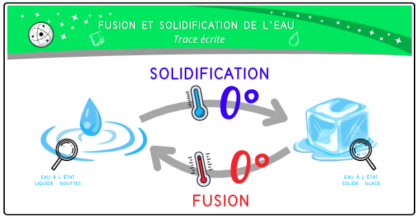 Savoir que l’eau à l’état liquide devient solide avec le froid et que l’eau a l’état solide devient liquide avec la chaleur.