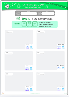 Toutes les 30 à 45 minutes, le.la PE invite les élèves à aller observer leurs expériences : « Vous allez observer l'évolution de votre expérience. Vous notez vos observations dans la deuxième case de votre fiche : vous écrivez l'heure, vous dessinez ce que vous avez observé et vous entourez l'état dans lequel est l'eau : "solide" ou "liquide". »