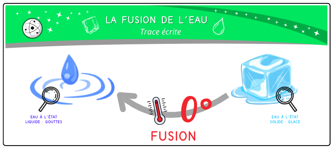 Le.la PE projette la trace écrite et l'explique : « Le glaçon fond quand la température est supérieure à 0°. Le passage de l'état solide à l'état liquide s'appelle la fusion. »